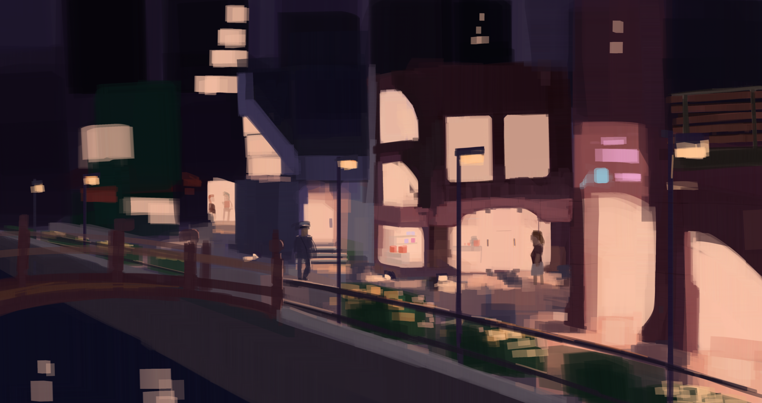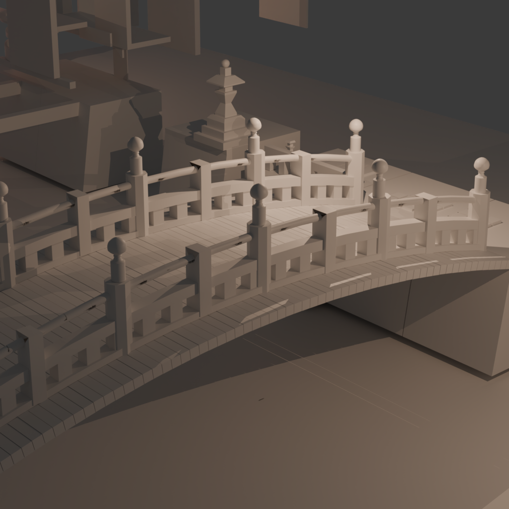 As an experiment I wanted to incorporate more wooden architecture wooden bridge to contrast the ceramic material that is frequently used in contemporary styles. A Japanese style bridge was used as inspiration for the one modeled in the image below, with block in other props around it to provide a more interesting composition. It is intended to be a more artistic statement that shows the viewer that aesthetics is more emphasized than it would normally be.